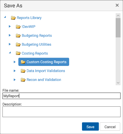 In the Save As dialog, select the folder where you want to save the report, then enter the File name and optional Description. Click Save to save the report to the specified location.
