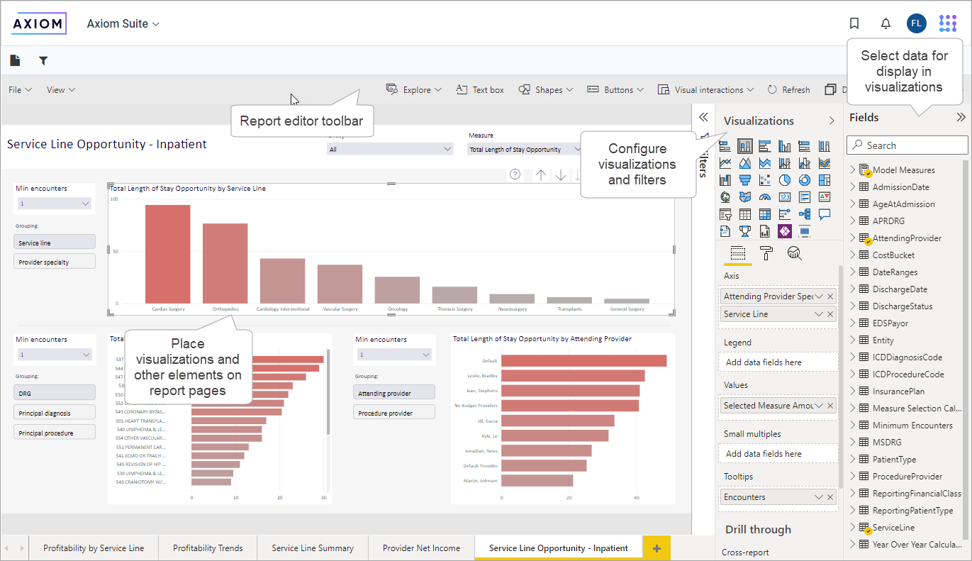 The visualization report editor uses Microsoft Power BI technology embedded within Axiom Budget Planning and Performance Reporting. When you open a visualization report in edit mode, a third toolbar becomes available to provide access to report editing features. The panels along the right-hand side of the editor provide access to visualizations and your Axiom Budget Planning and Performance Reporting data.