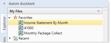You can save Axiom files and other items as favorites for quick access to commonly used items. In the Desktop Client General term for using either the Excel Client or the Windows Client, both of which are installed to the user's desktop., your favorites list is available in the following locations: