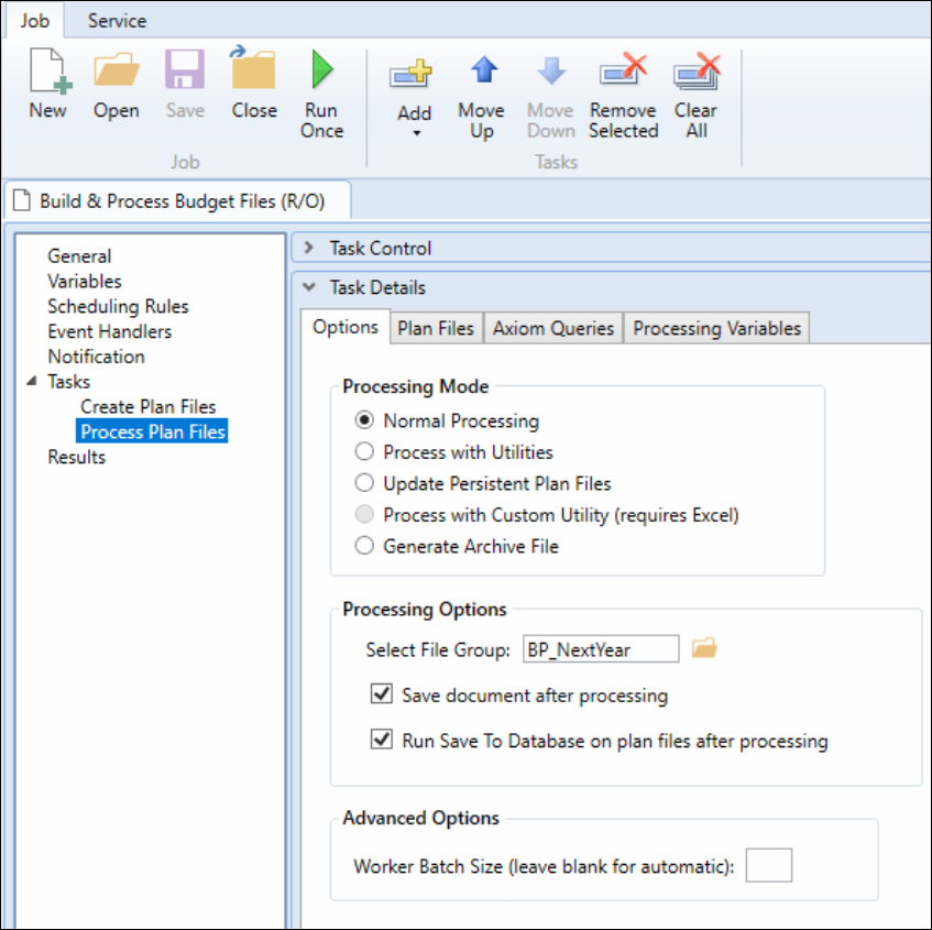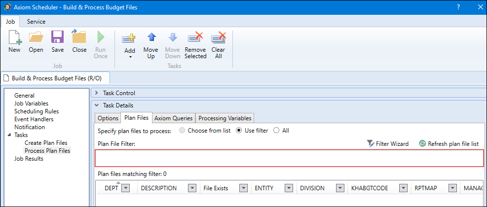 3. You can apply filters when processing plan files. For example, you want the to only run for a selected Entity or Dept. To apply filters, in the Task Details section, click the Plan Files tab. Select the Use filter radio button to access filtering options.