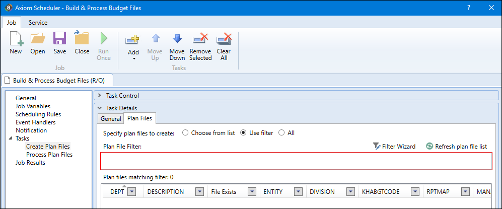 5. To create specific plan files, you can apply filters, as needed. For example, to only run for a selected Entity or Dept. To apply filters, in the Task Details section, click the Plan Files tab. Select the Use filter radio button to access filtering options.