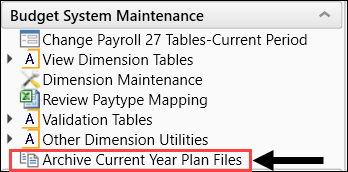 6. In the Bud Admin task pane, in the Budget System Maintenance section, double-click Archive Current Year Plan Files.