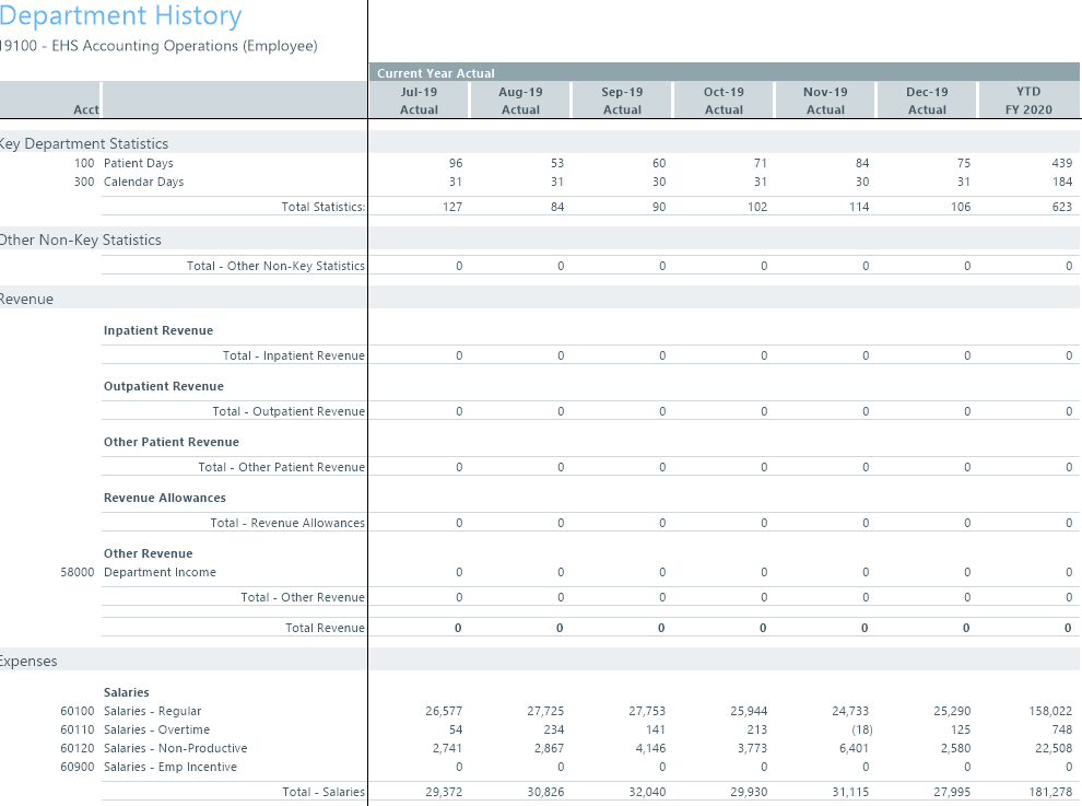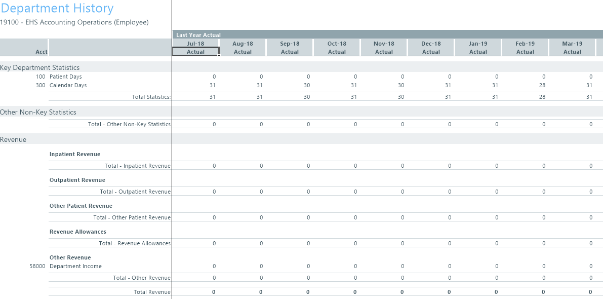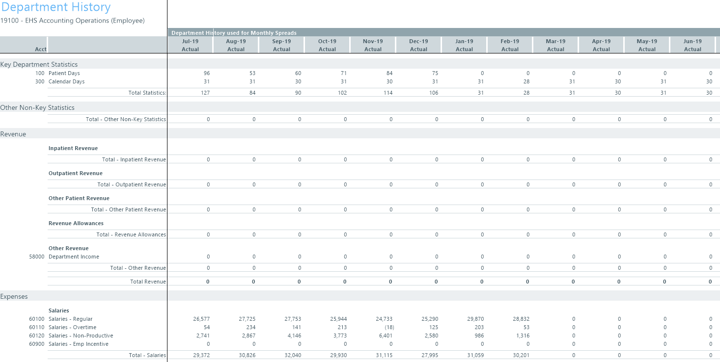 • Department History used for Monthly Spreads - Includes a combination of YTD values plus the actuals from the previous year to form a full 12 months of data. In the following example, the actuals are posted through February 2019. In the Monthly Spreads section, the actuals are copied from July through February. But, for the missing months that have no actuals yet, the system copies the data from Last Year Actual and enters them for the missing months. In this example, the March through June actuals are copied from the same months in the Last Year Actual section.