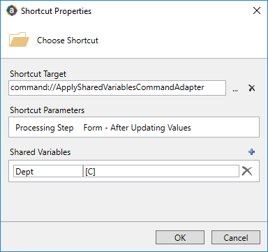 When the Apply Shared Variables command is selected from the Command Library as the shortcut target, it displays as command://ApplySharedVariables or command://ApplySharedVariablesCommandAdapter (legacy syntax).