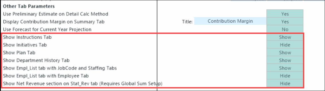 This driver contains a variety of general configuration settings that affect the majority of budget plan files. This is typically the first driver file you edit prior to creating a budget. Cells formatted in light blue accept either numeric or text input, depending on the data request. Cells formatted in green indicate drop-down selections.