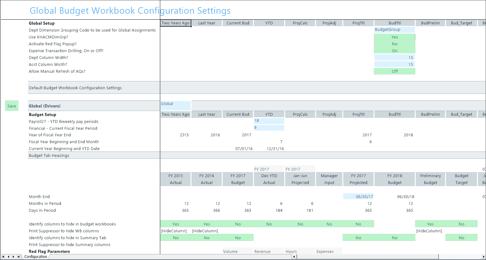 This driver contains a variety of general configuration settings that affect the majority of budget plan files. This is typically the first driver file you edit prior to creating a budget. Cells formatted in light blue accept either numeric or text input, depending on the data request. Cells formatted in green indicate drop-down selections.