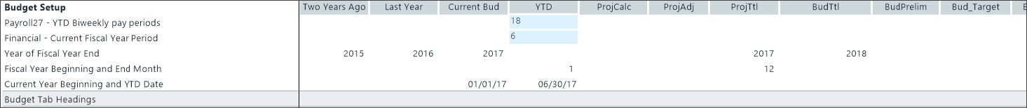Payroll27 - YTD Biweekly Pay Periods Indicates how many pay periods have elapsed in the current fiscal year, in case you need to create a budget for a fiscal year already in progress.
