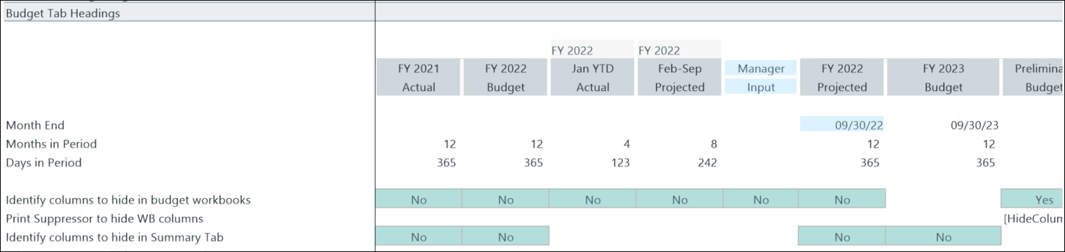 Identify columns to hide in Summary Tab Allows you to control which columns to display on the Summary sheet of the budget plan files. Set to Yes to hide, No to display in the budget plan files.
