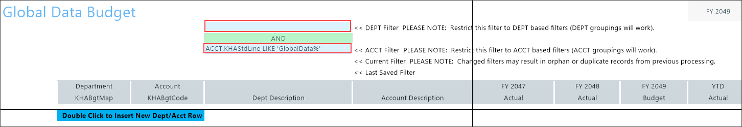 - When inserting a new department or account row, the system only offers a selection of departments or accounts that meet the filter criteria. You cannot enter the department or account number by typing it in the field.