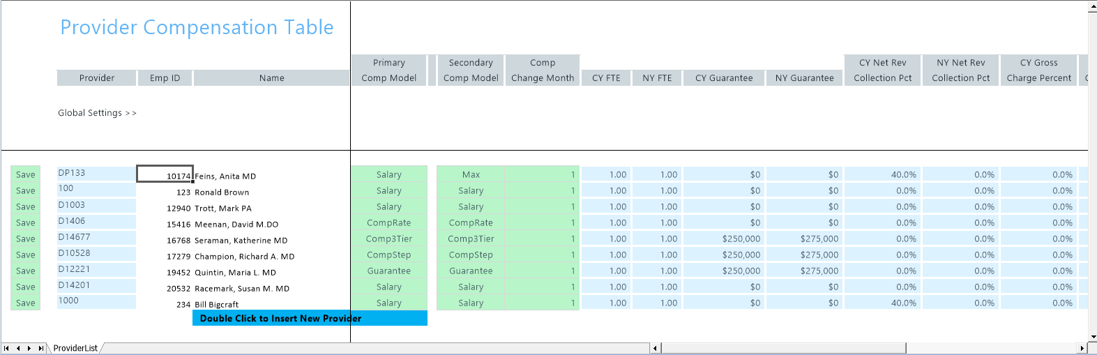 The Budget Provider List driver is the master list of all the physicians whose compensation is calculated on the ProviderComp worksheet.