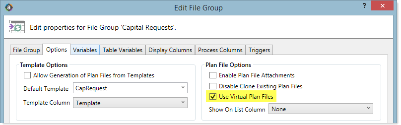 If the templates in a file group are designed to support rebuildable plan files, it is recommended to enable virtual plan files to improve system performance. To enable virtual plan files, select the option Use Virtual Plan Files. This option is located on the Options tab of the Edit File Group dialog, in the Plan File Options section.