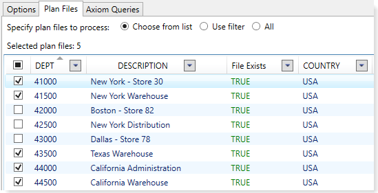 To process certain plan files, select Choose from list, and then select the check boxes for the plan files that you want to process. When you start processing, Axiom Budget Planning and Performance Reporting will process only the selected plan files.