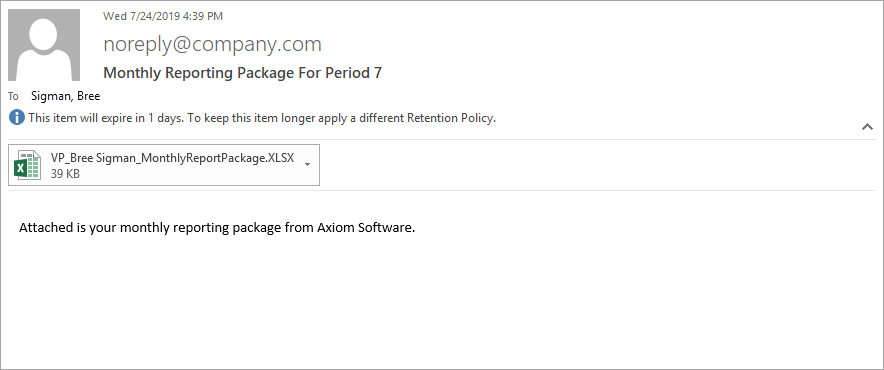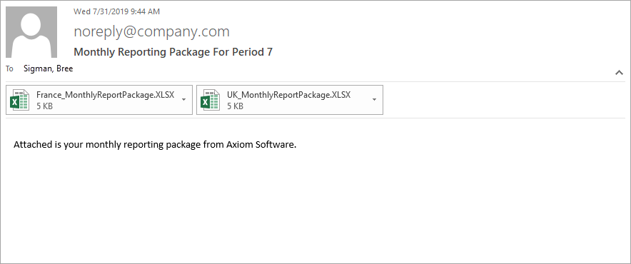 When the phase 2 file collect report is processed as the last item in the batch, the relevant region report packages are emailed to the appropriate VPs. In the following example, this VP is responsible for two regions, so two report packages were attached to the email.