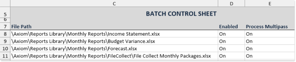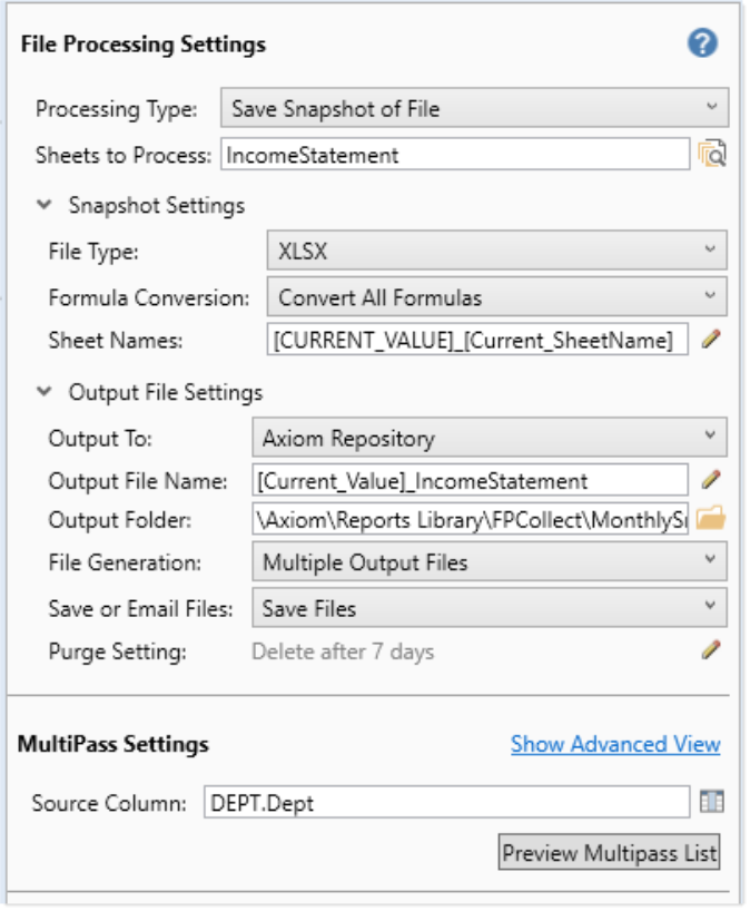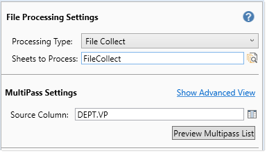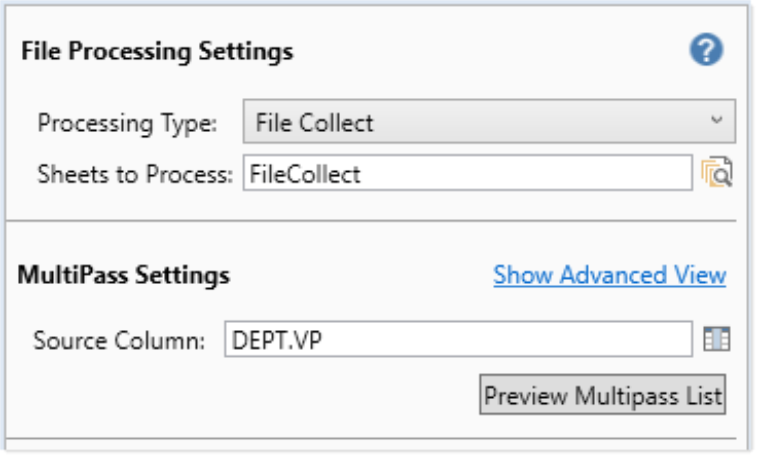 In this example, the file collect setup is fairly straightforward, because the goal is to create one report package for each VP and deliver that package to the VP. In the File Processing task pane, the process is configured for multipass processing by Dept.VP.