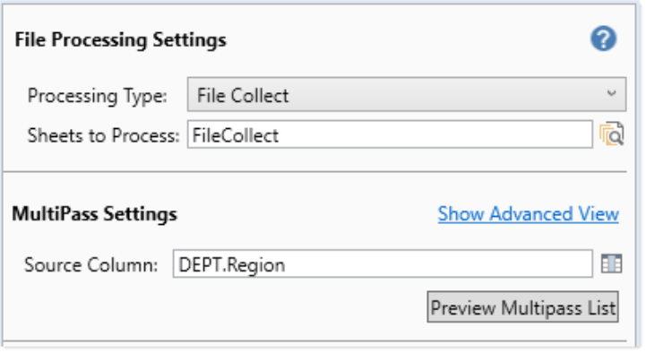 The first file collect report (phase 1) will collect the department reports into a report package per region. In the File Processing task pane, the process is configured for multipass processing by Dept.Region.