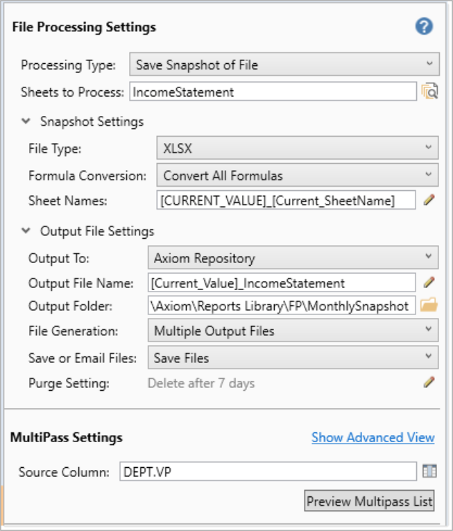 The first three reports are set up using standard snapshot processing, to process each report by VP and then create a snapshot. The snapshot output files are prefixed with the VP name and saved to a designated output folder. The following screenshot shows an example of the snapshot settings.