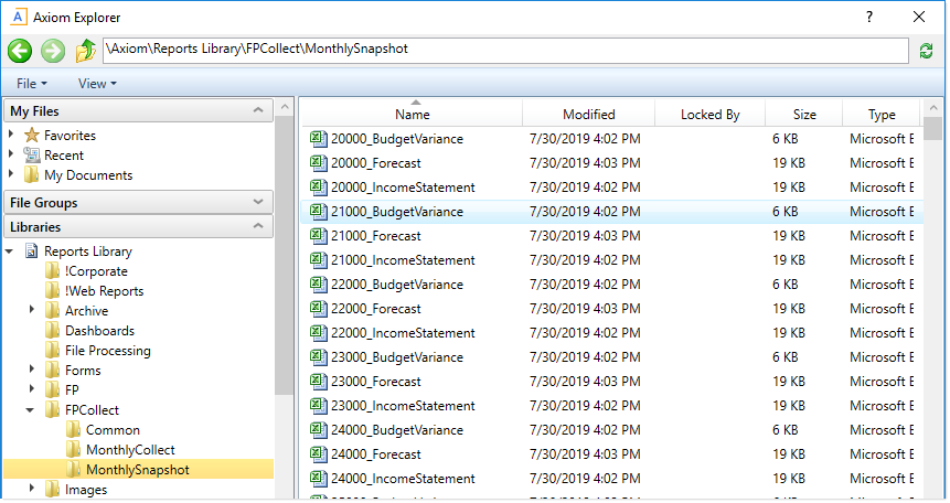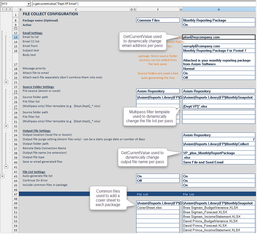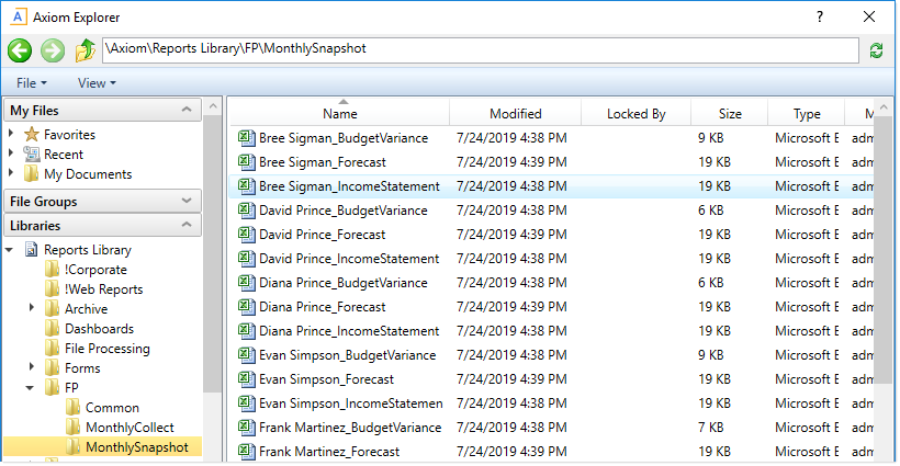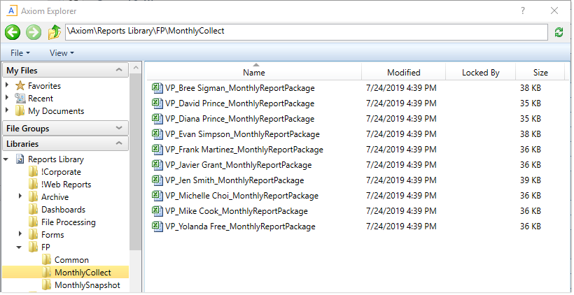 {Dept.VP}*.xlsxis used to dynamically filter the file list to only return the snapshots that start with the current VP name. For example, when the current VP is Bree Sigman, the filter template is resolved asBree Sigman*.xlsx, which will collect the first three files in the example snapshot folder shown previously. - The GetCurrentValue function is used in the output filename, to prefix the name of the resulting report package with the VP name.