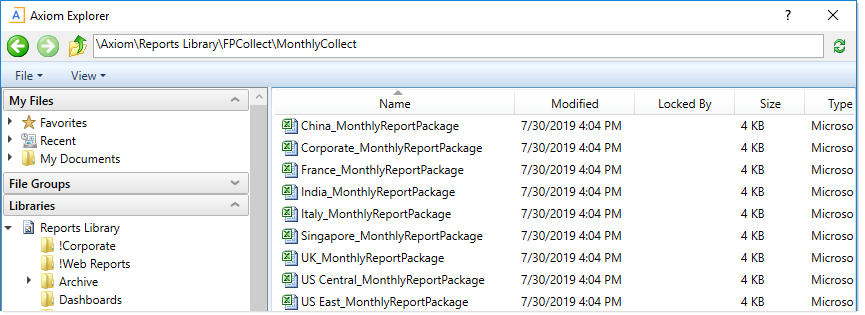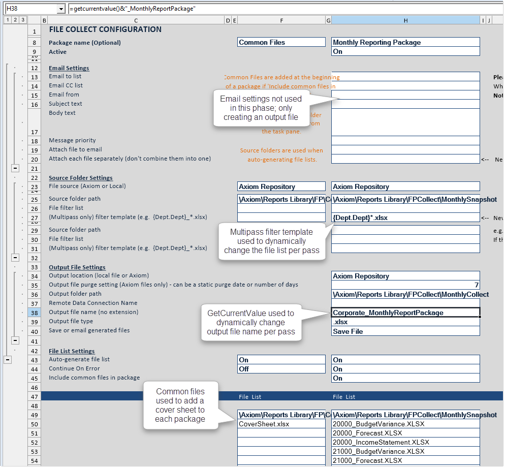 {Dept.Dept}*.xlsxis used to dynamically filter the file list to only return the snapshots that start with the department codes for the current region. For example, when the current region is US West, the filter template will be resolved using department codes such as 40000*.xlsx, 40500*.xlsx, 44000*.xlsx (and so on, depending on which department codes belong to the current region). - The GetCurrentValue function is used in the output filename, to prefix the name of the resulting report package with the region name.