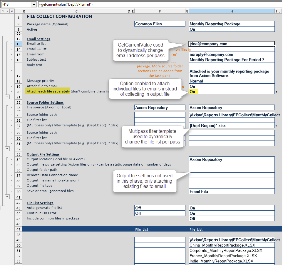 The second file collect report (phase 2) will send an email to each VP and attach the appropriate region files to the email, where some VPs are responsible for multiple regions. In the file processing task pane, the process is configured for multipass processing by Dept.VP.