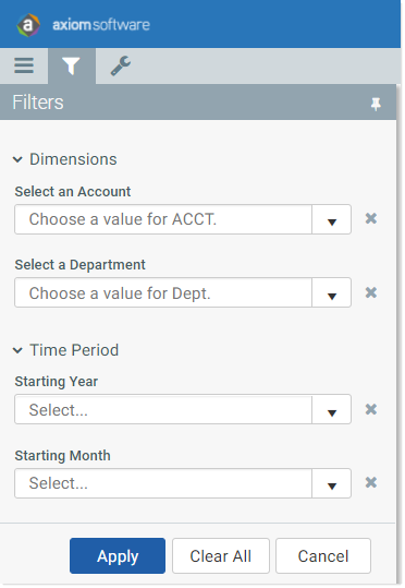 In Axiom forms, users interact with refresh variables using the Filters panel. The Filters panel is available by clicking the filter icon in the Task Bar The toolbar that displays across the top of Web Client pages, underneath the Navigation bar. The Task bar provides access to various tasks that are specific to the current area, page, or document.. The refresh variables defined in the form source file automatically display in the panel.