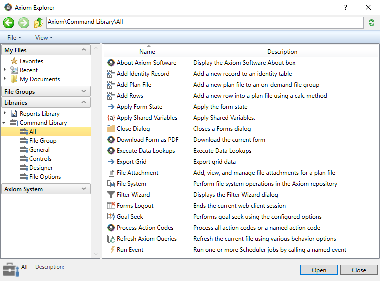 In the Axiom Explorer dialog, select the Command Library, then select RunEvent, then click Open.