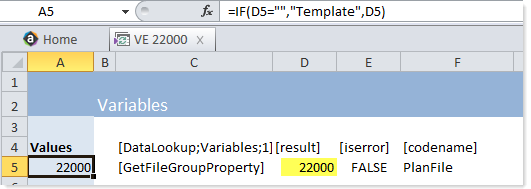 Within the parent template, the current plan code is typically retrieved by using a GetFileGroupProperty data lookup. This data lookup is typically placed on a dedicated sheet (such as "Variables") that retrieves various values used by the template. In the following example, the data lookup result is returned into column D, but we are reading the final values from column A (so that we can use formulas to apply different values for the template versus the resulting plan files).