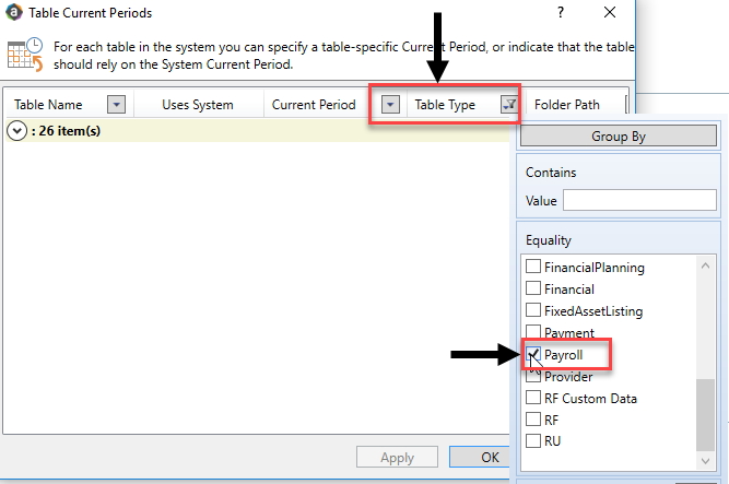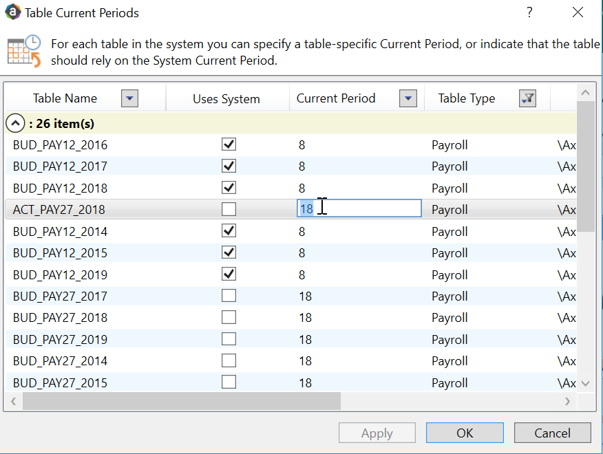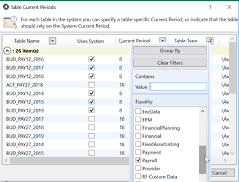3. Change the period for all of the payroll tables where the Uses System checkbox is not selected.
