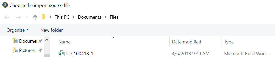 9. In the Choose the import source file dialog, navigate to the location where you stored the source file and select it.
