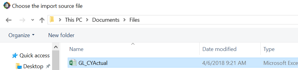 Make sure to create and save the import file to a directory accessible by the Axiom Application server. We recommend naming the file with a GL_ prefix.