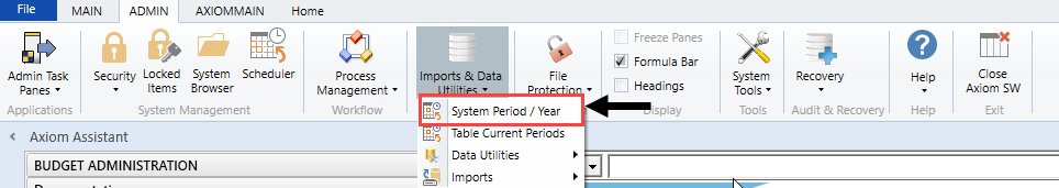 To change the current period, in the Admin ribbon tab, in the Database group, click Imports & Utilities > System Period/Year.