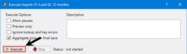In the Admin ribbon tab, in the Database group, click Imports & Data Utilities > Imports > Management Reporting > 01-Load GL 12 Months, and click Execute.