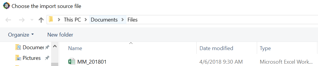 In the Choose the import source file dialog, go to the location where you stored the source file and select it.