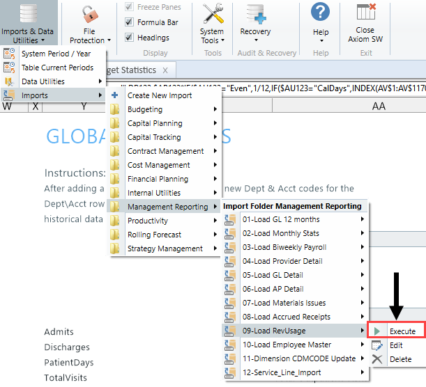In the Admin ribbon tab, click Imports & Data Utilities > Imports > Management Reporting > 09-Load RevUsage > Execute.