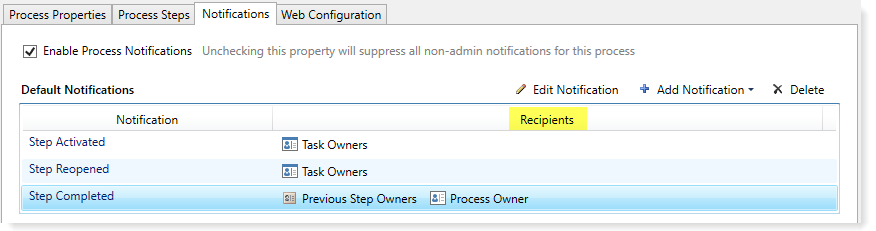 When you create or edit a notification at any level of the process, you can specify the recipients on the Notification Configuration tab of the Edit Process Notification dialog. The Add Recipient list only shows the recipients that are valid for the current notification type and process type.