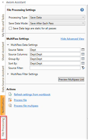 In the File Processing task pane, click Process file multipass to run the utility by department and post the values to the database. Repeat this step for the Hours by refreshing the report variables, select Hours from the refresh variable, and then Process File multipass. If you also load statistics into you biweekly payroll tables, you can also run this utility to move the statistics to your financial data source.