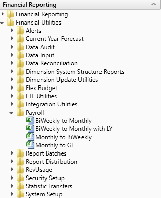 You can also access them from the Bud Admin task pane. In the Financial Reporting section, click Financial Utilities > Payroll.