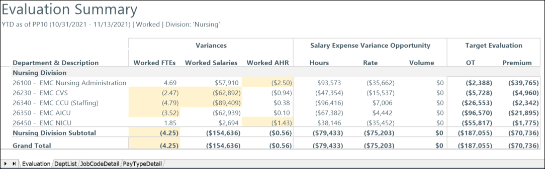 The Evaluation tab on the Department Management Productivity report shows a summary of departments that are unfavorable to the conditional rules that you set on the DeptList tab for FTEs, Salary Expense, and Rates. This tab presents those departments that require additional review.