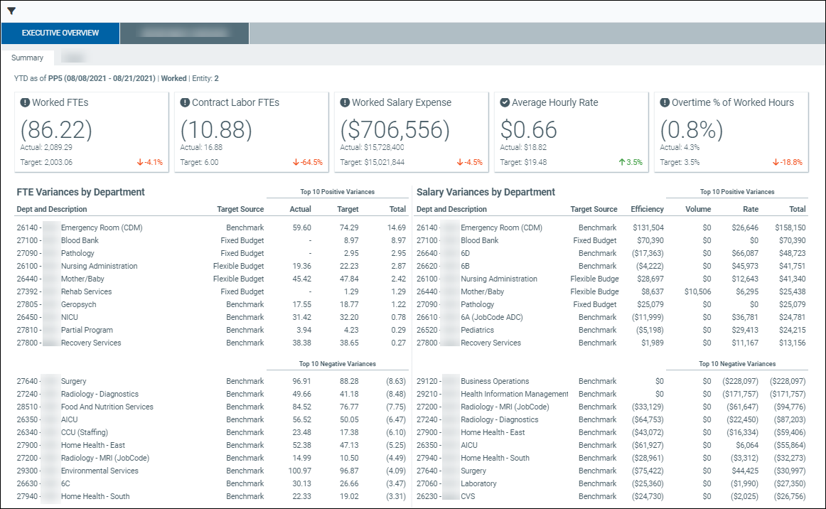 Top 10 Negative Variances The bottom 10 unfavorable FTE and salary variances by department.