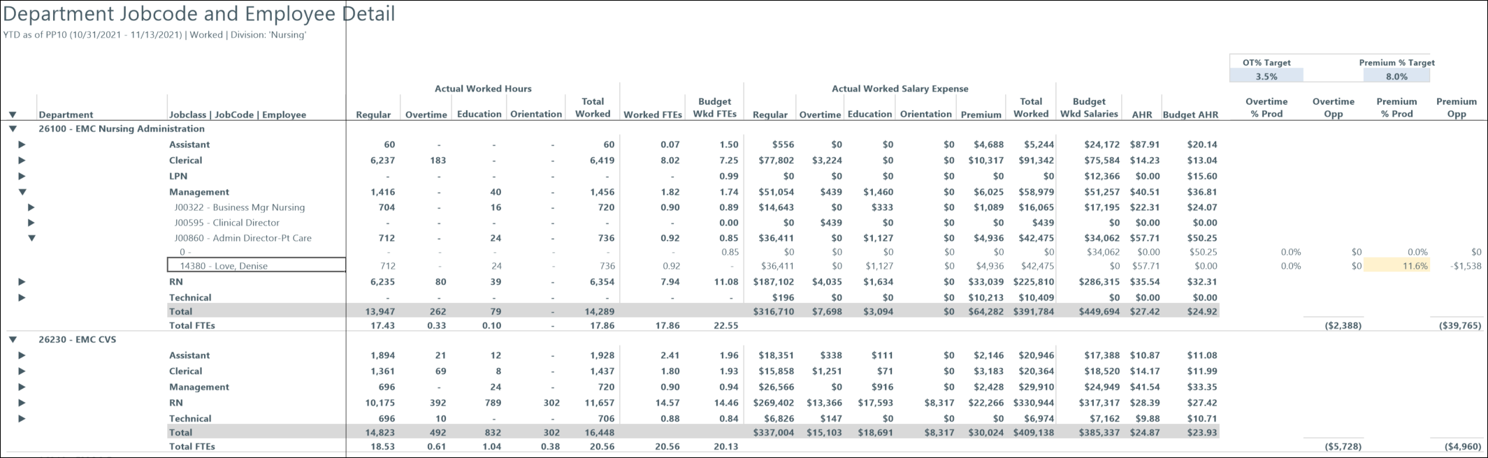 You can review paytype data beginning at the Job class summarized level or drill into the Jobcode and Employee levels.