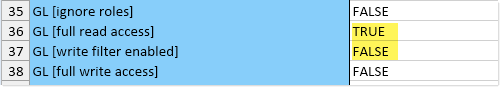 All table types are listed first, followed by all individual tables. If [write filter enabled] is False for a table or table type, the user or role's write access permissions are the same as their read permissions. In this case, the other write access permissions in the spreadsheet can be ignored because they do not apply. For example, the following user has full read and write access to the GL table type, because [full read access] is True and [write filter enabled] is False. Even though [full write access] displays False, it does not matter because the setting does not apply.