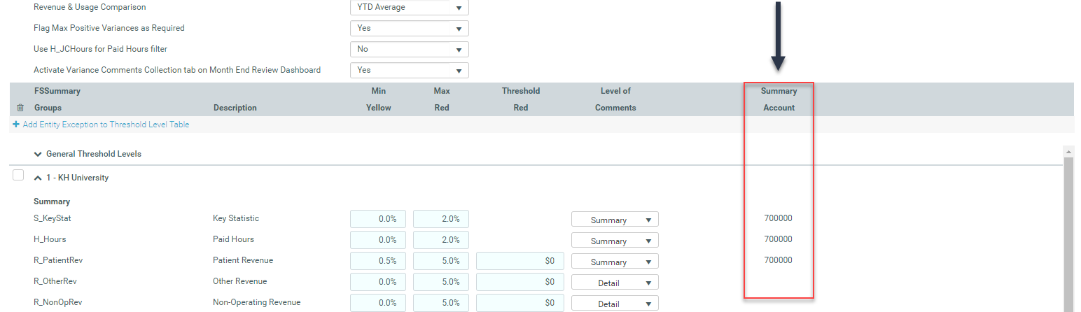 In the Summary portion of the General Threshold Levels section of the page, you may decide whether to collect comments at a summary level or account detail level.