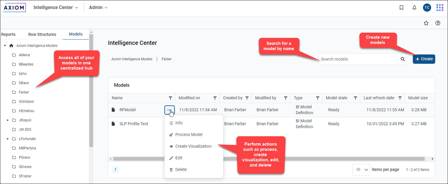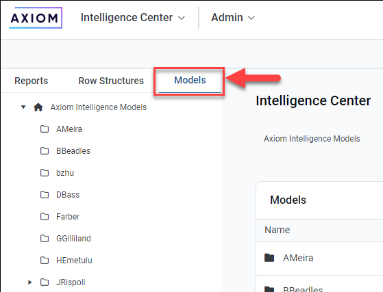The Axiom Visual Insights model library is located on the Models tab of Intelligence Center.