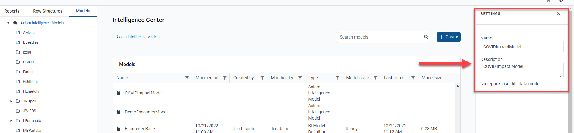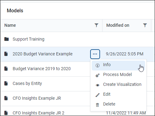 After the model is displayed in the Intelligence Center grid, hover your cursor over the Name column to make the ellipsis visible. Click the icon, and then select Info from the menu.