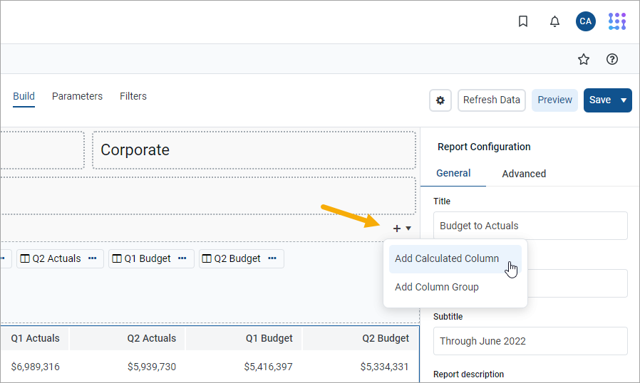 Return to the Build tab, and then click the plus + icon at the top right of the Column Definitions box to add calculated columns to the grid, as needed. For more information, see Add data columns and calculated columns to a web report.