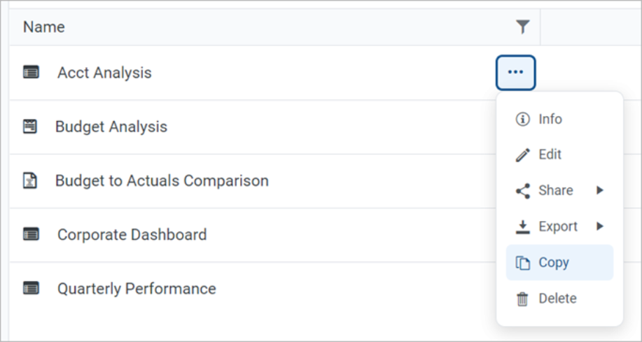 2. After the web report appears in the Intelligence Center grid, hover your cursor over the Name column to make the ellipsis icon visible. Click the icon, and then select Copy from the menu.