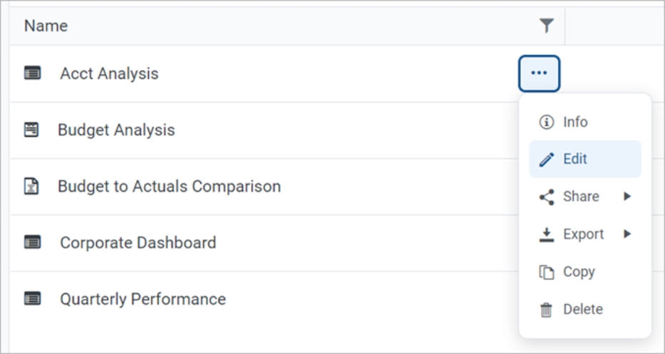 2. After the report appears in the Intelligence Center grid, hover your cursor over the Name column to make the ellipsis icon visible. Click the icon, and then select Edit from the menu.