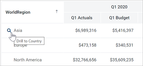 The tooltip for the magnifying glass is either Drill (if multiple drill paths are available) or Drill to <path> (if a single drill path is available). For example, the tooltip is Drill to Acct if the Acct drill path is the only available drill path.