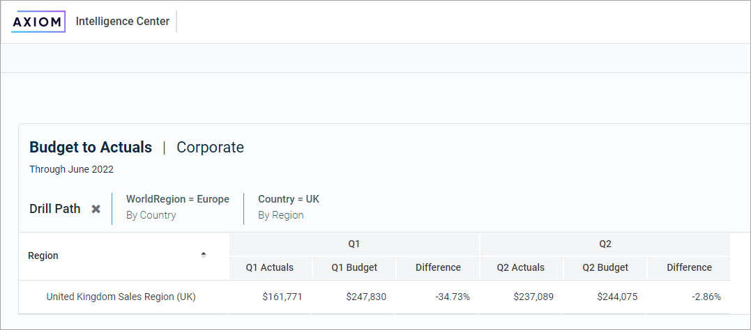 Continue drilling the drill results if additional drill paths are available. Return to a previous path by clicking the path name in the header. When you are finished viewing the drill results, click the X icon in the drill path to clear the drill and return to the original report.
