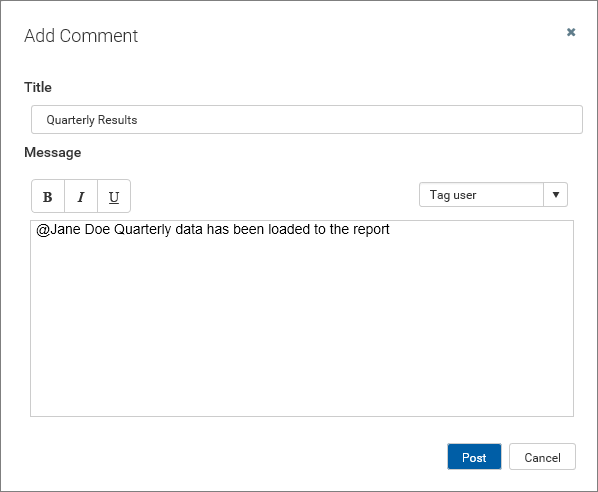 When you click Post, the comment is saved to the message stream and any tagged users are notified.