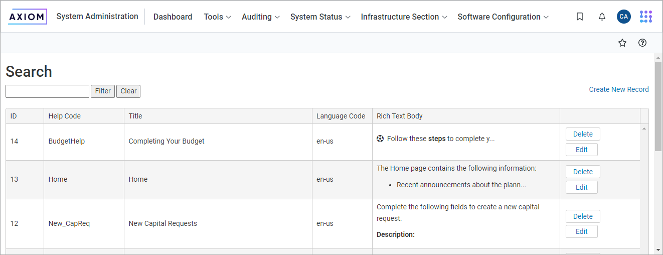 You can use the Search box at the top of the page to filter the grid. The search checks for matches in the following fields: Help Code, Title, and Rich Text Body. This can be helpful to locate a particular help code.